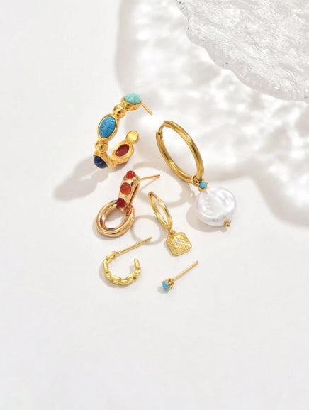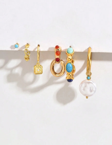 6pcs Set Asymmetrical Turquoise & Cubic Zirconia Earrings.