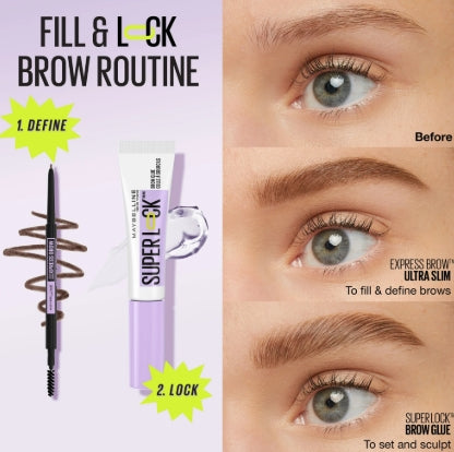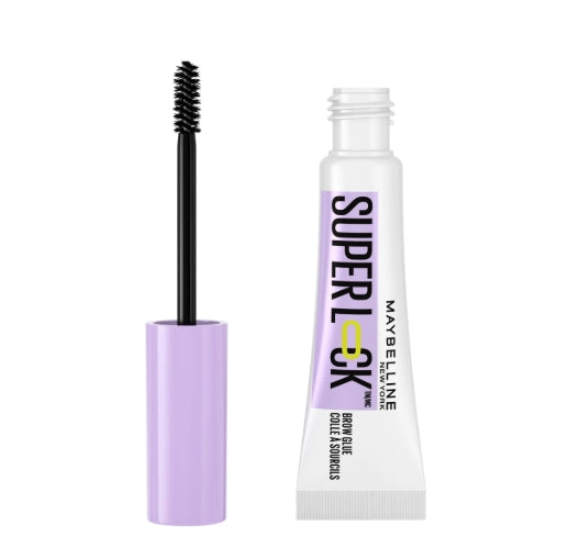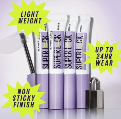- Maybelline NY Super Lock Brow Glue gives brows a comfortable finish without the sticky feeling. Now you can lock in a sculpted look that lasts with this flake resistant long lasting clear eyebrow gel