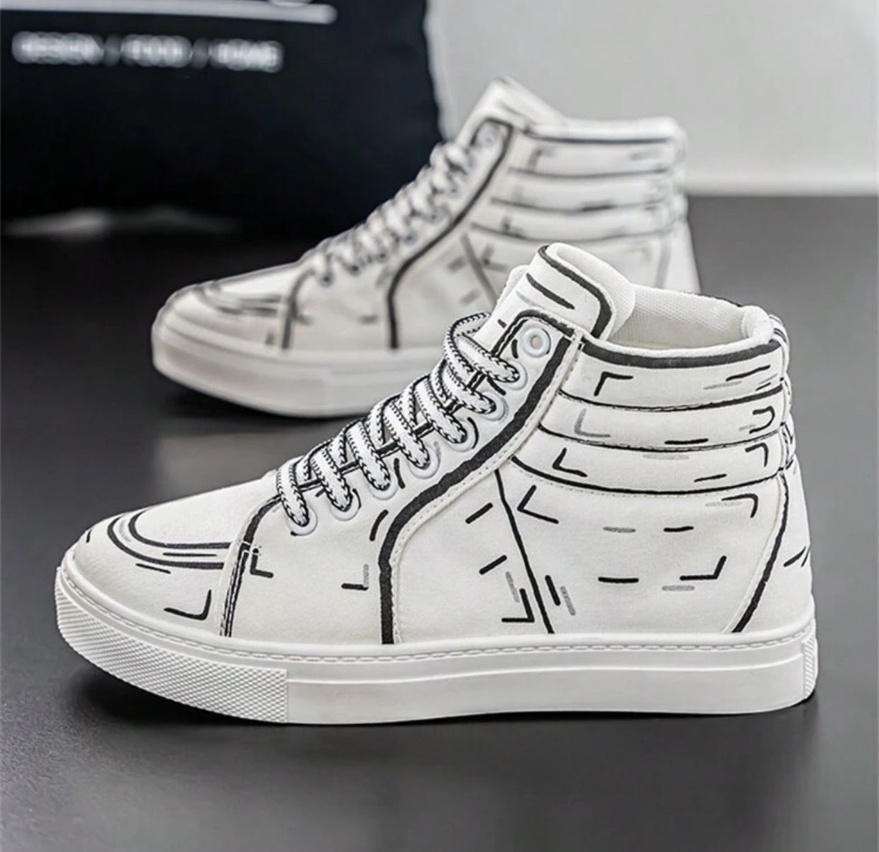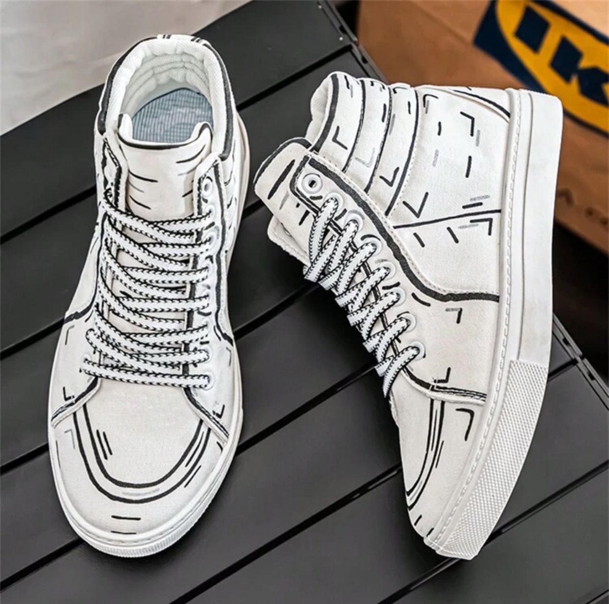 Men's Black & White Casual Sports Shoes, Canvas Breathable Skate Shoes With Asymmetrical Print High-Top.