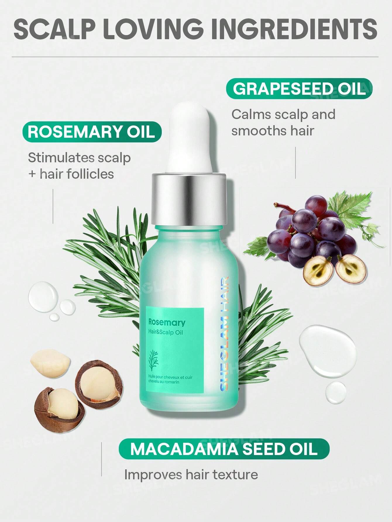 This hair oil is enriched with Rosemary Oil to stimulate hair follicles, Macadamia Seed to improve hair quality, and Grapeseed Oil to soothe the scalp and smooth hair for a healthier scalp and shinier, more moisturized hair.